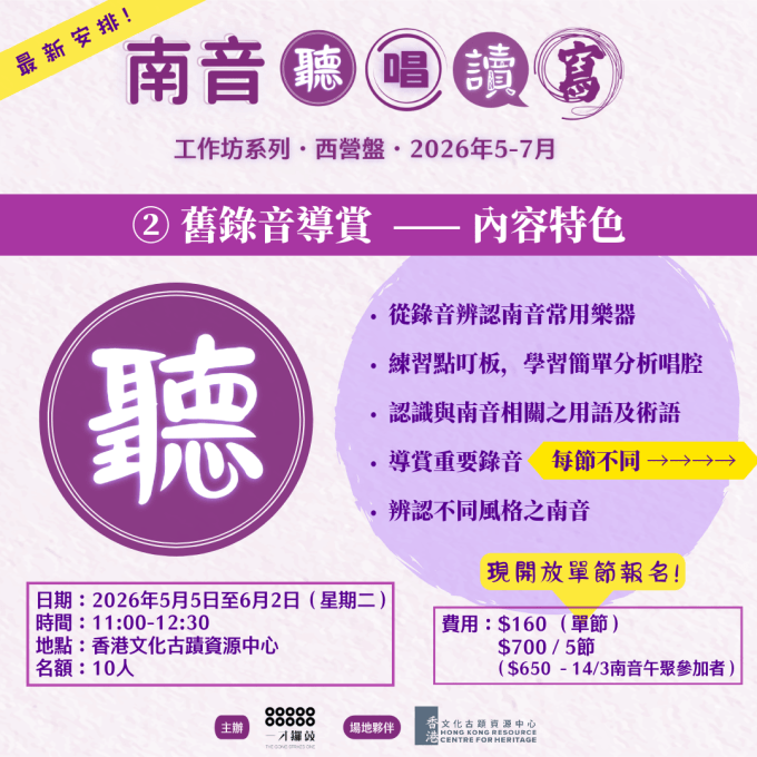 所有工作坊及南音午聚將於香港文化古蹟資源中心舉行。