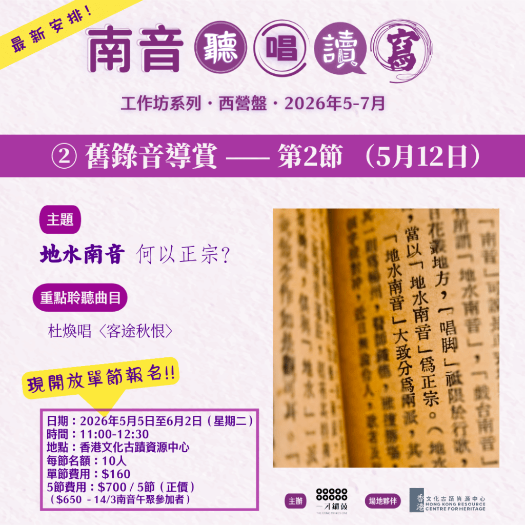 「南音聽.寫.讀.唱工作坊系列」首辦於2025年,今年將會來到西營盤的香港文化古蹟資源中心 —— 十年前一才鑼鼓上演第一場完整南音說唱演出的地方,別具意義!