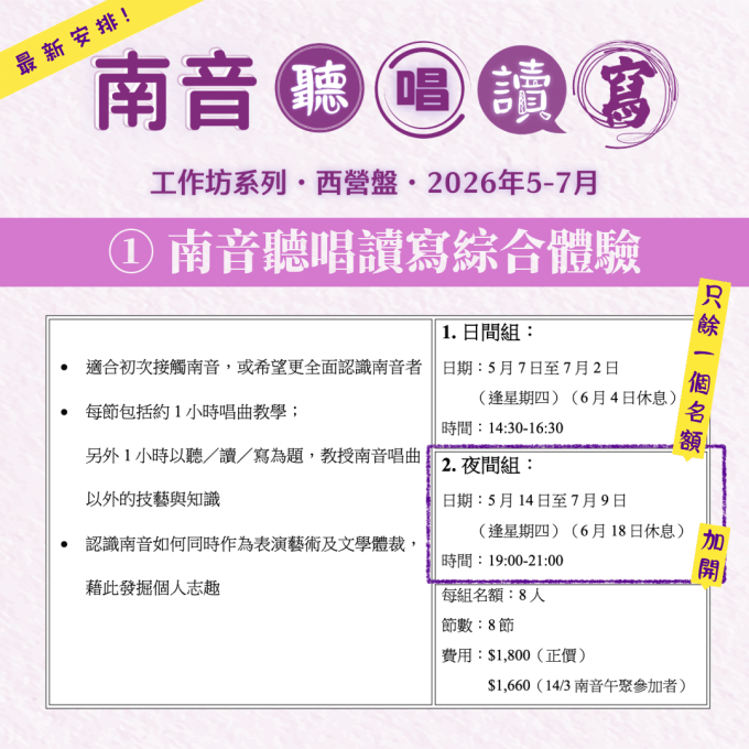 ① 南音聽.唱.讀.寫綜合體驗工作坊 (8節) [名額:8人]